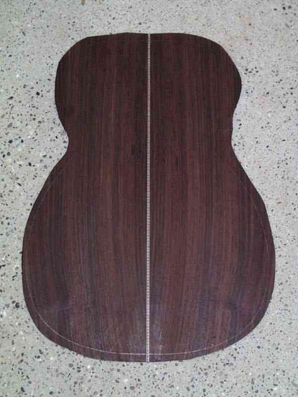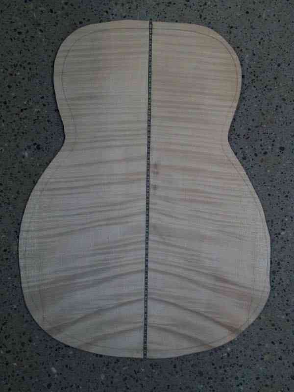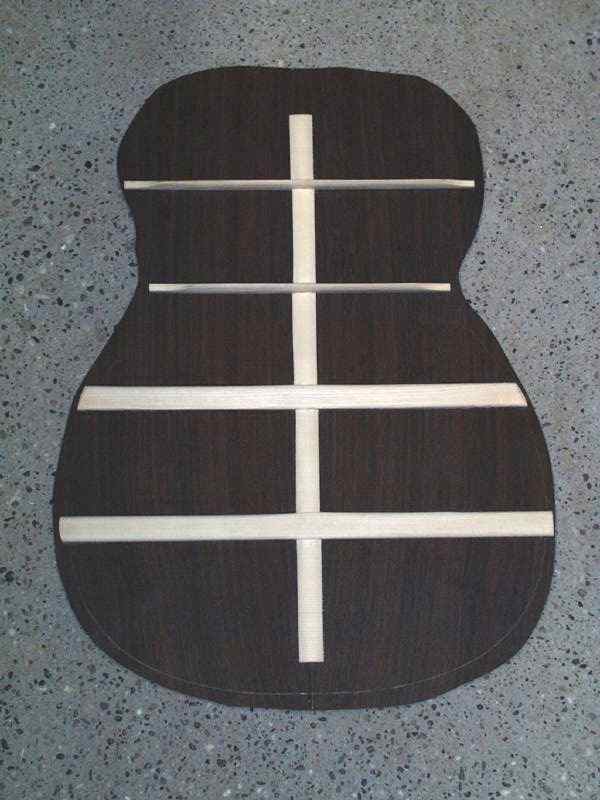 Der Boden ist normalerweise wie die Decke aus zwei gespiegelten Brettchen zusammengeleimt. Der Boden hat zusammen mit den Zargen (=Gitarren Seiten) techisch die Aufgabe, den Korpus steif und gerade zu halten. Da die Tonerzeugung über angeregte Saitenschwingung über die Decke verläuft, braucht der Boden und die Zargen nicht die eigenschaften besonders leicht und schnelles Ansprechverhalten zu haben. Üblicherweise verwendet man dazu Harthölzer wie z.B. Ahorn, Palisander aber auch auch mit selteneren Sorten wie Birnbaum oder Kirsche lassen sich reizvolle Gitarren bauen.