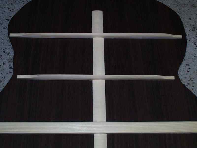 Wurden die Leisten mit dem Verleimhimmel aufgebracht, die Breiten mit dem Hobel bogenförmig geschnitzt, die Enden auf etwa 3-4mm Strärke auslaufend hingearbeitet, beendet man die Bodenherstellung mit einem letztmaligem Schleifen (240'er Körnung).
