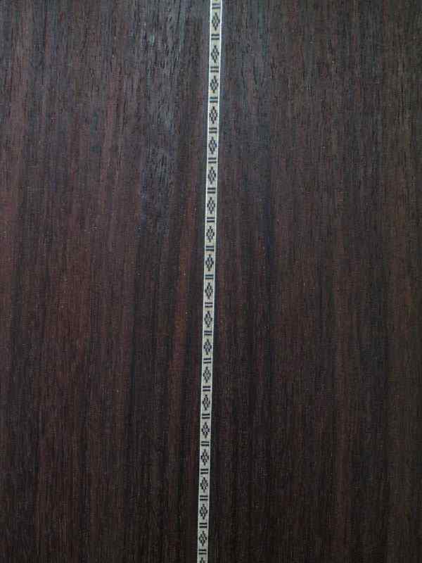 Die Mittelnaht des Bodens bekommt bei wertvolleren Instrumenten meist einen Verzierungssreifen. Je nach Vorbild, haben spezialisierte Hersteller verschiedene Muster im Angebot . Ich habe einen mit etwa 5x2mm Querschnitt gekauft. Den Kanal fräse ich mit der Oberfräse an einem Führungslinieal. Stimmt die Breite und Tiefe der Nut, lege ich ein kleines Leimbett vor und drücke dann den Streifen ein. Trocknen muß das nun auf einer ganz ebenen Fläche, am besten noch mit ein paar Hammern beschwert, damit der Zierstreifen nicht ungleichmäßig verleimt ist.