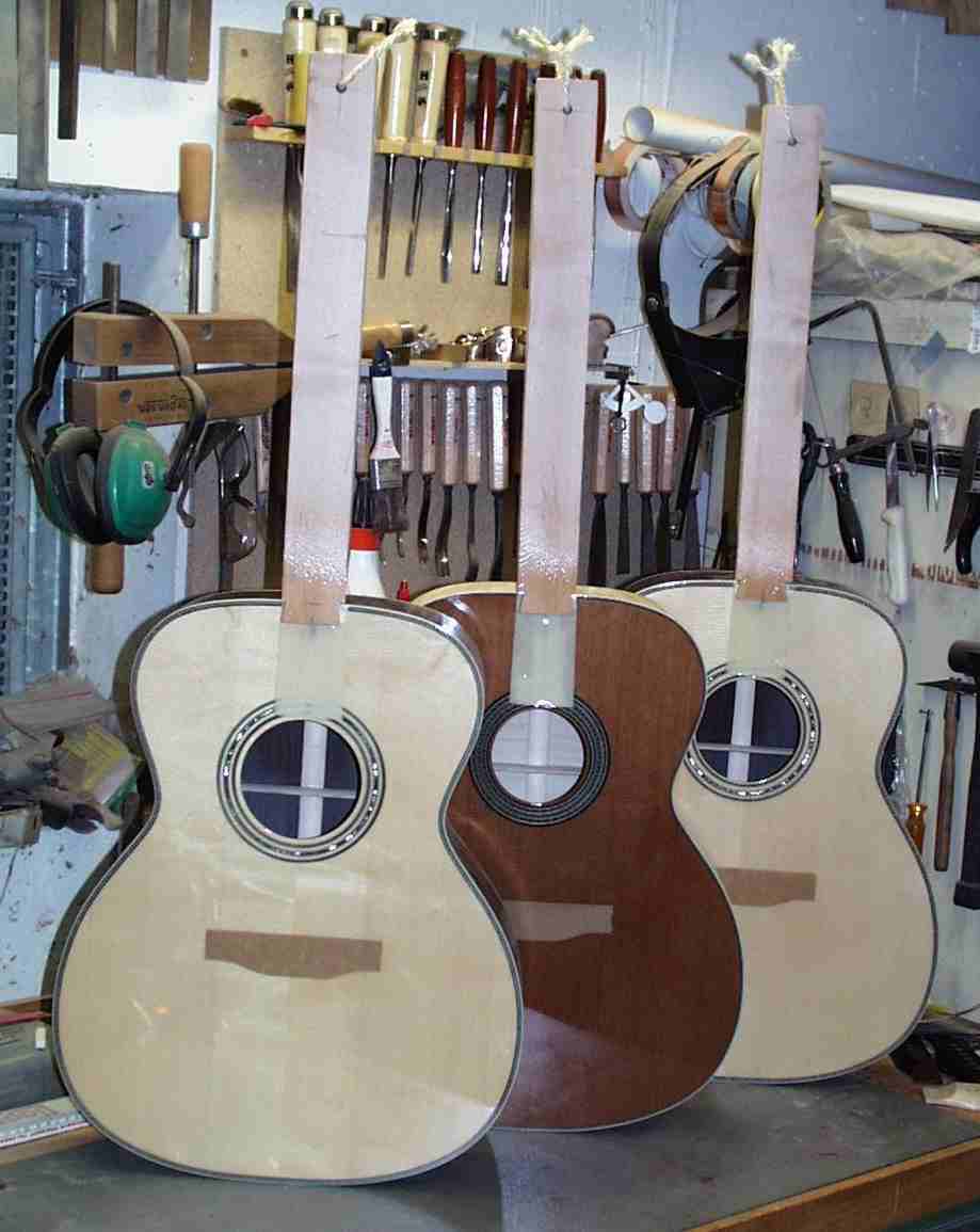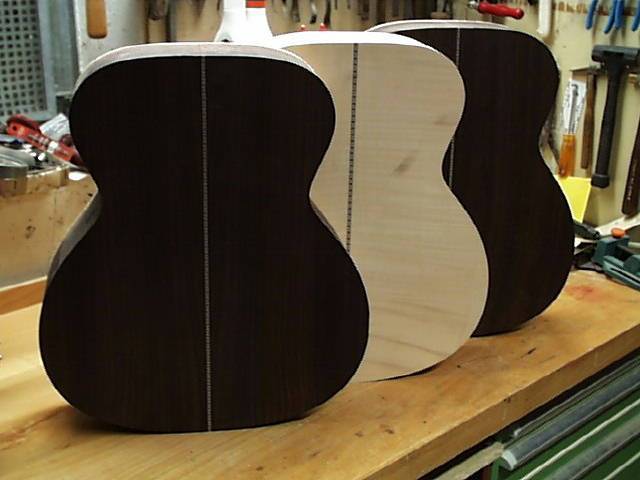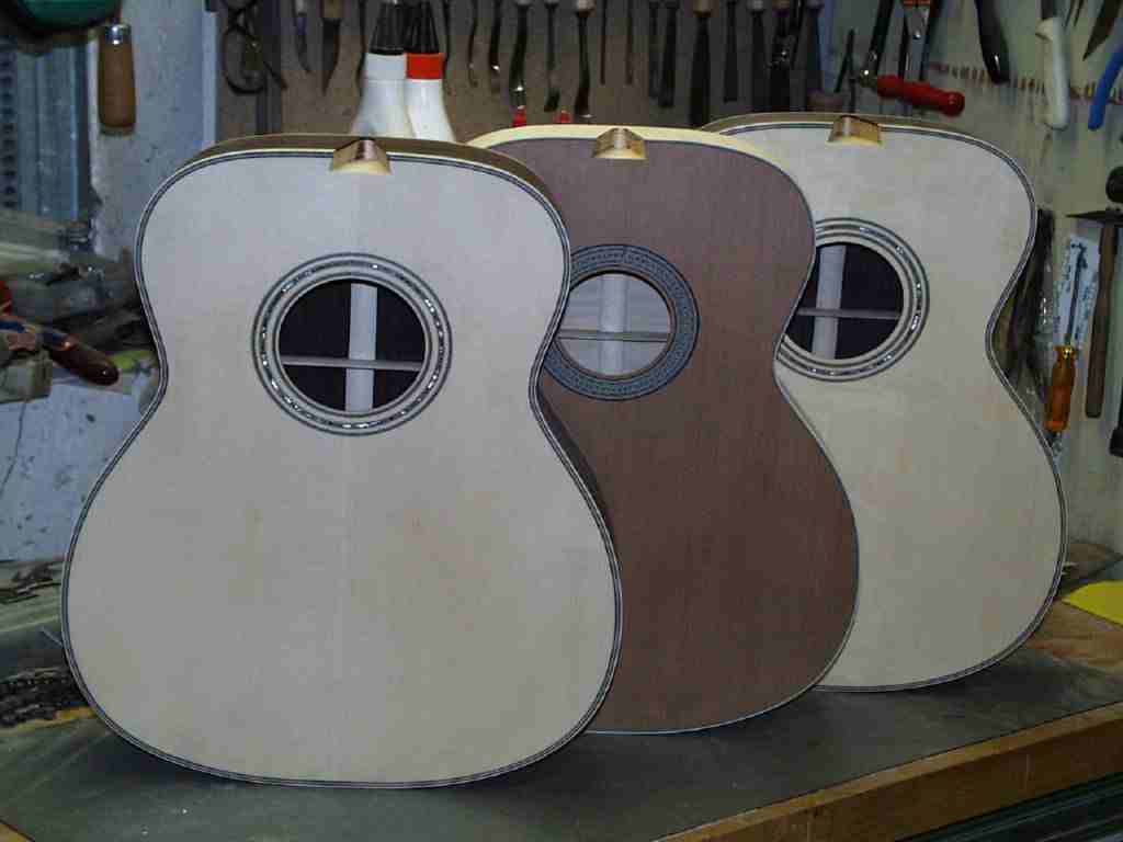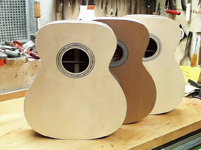 Hier kann man verschiedene Stadien der Korpusse sehen. Folgend diese gleich nach dem Verleimen von Decke und Boden. Die Außenmaße sind schon vorgefräst, die bindings warten schon.