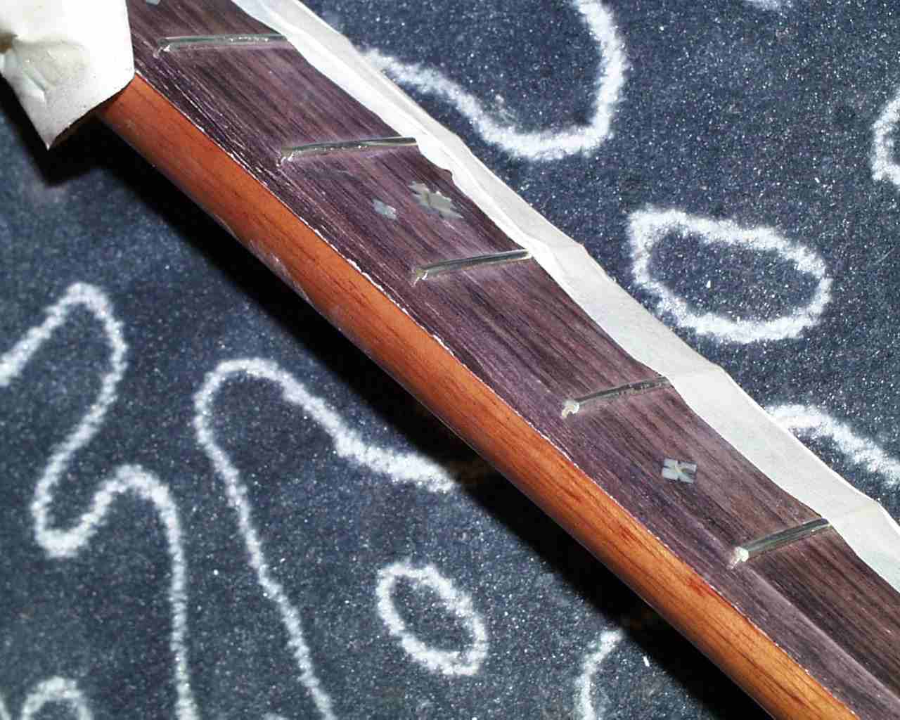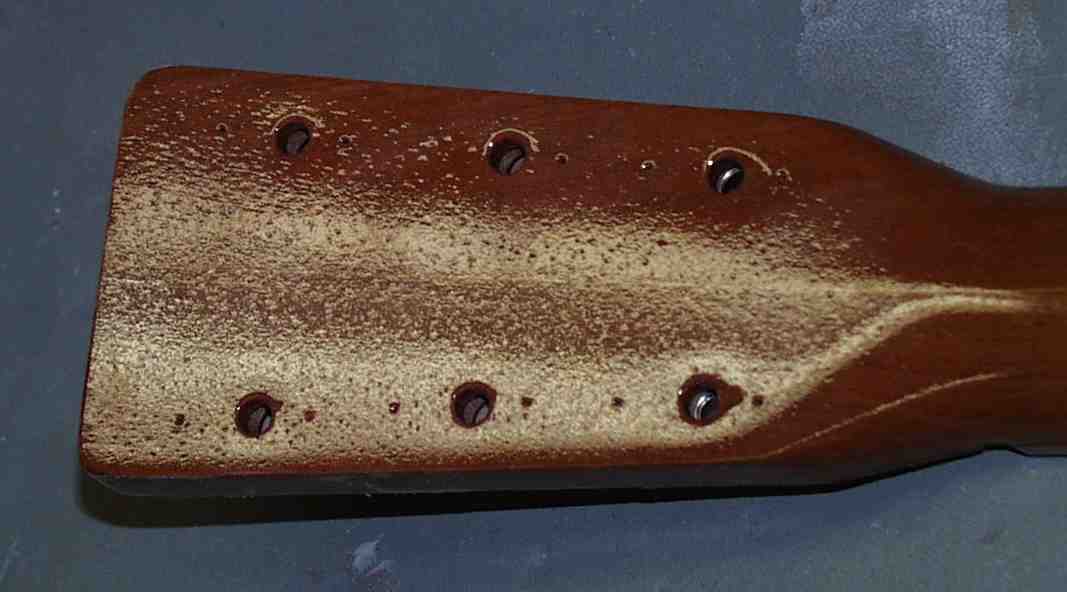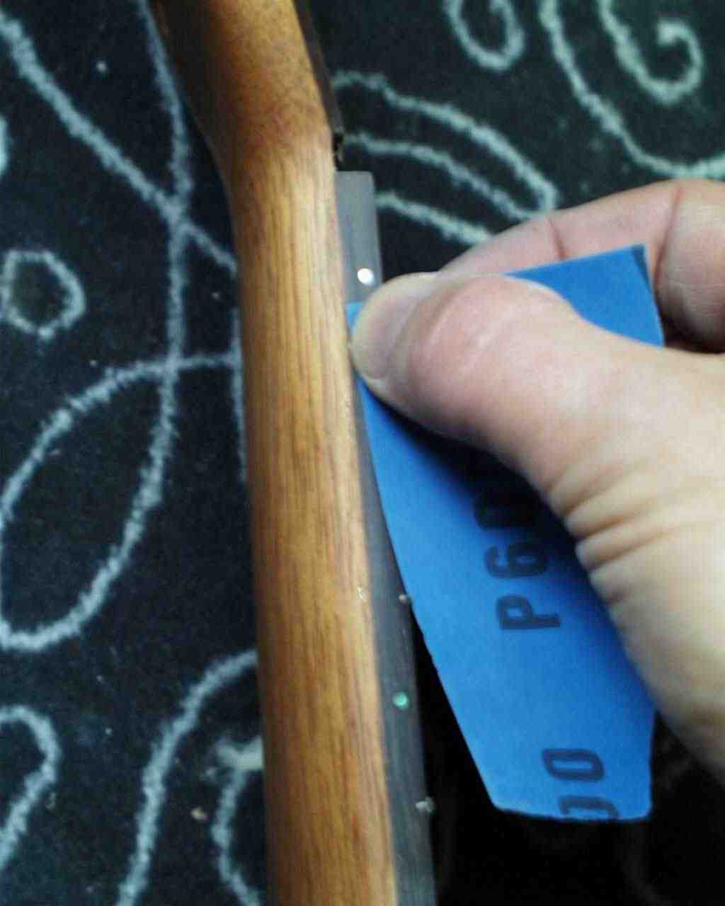 Wenn man die Abklebung am Hals entfernt hat, bleibt eine kleine Stufe zum Griffbrett. Mit etwas gröberen Schleifpapier gleiche ich diese Stufe an.