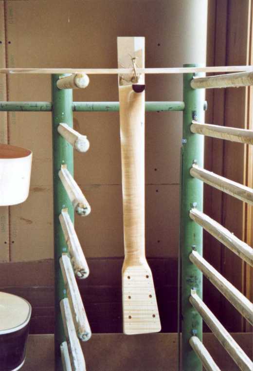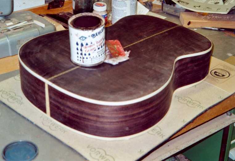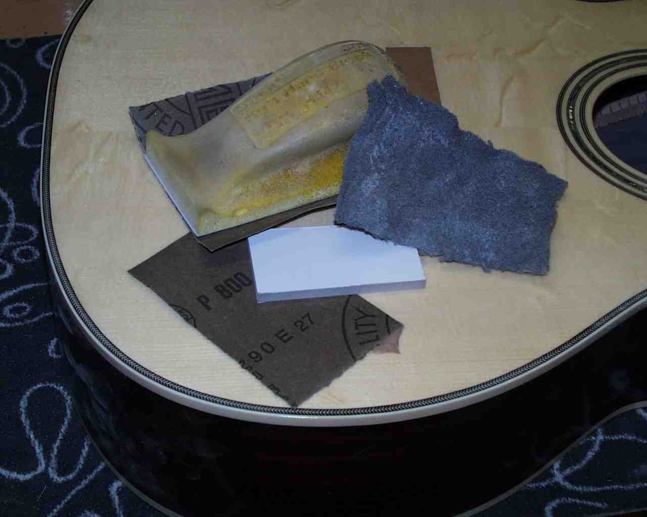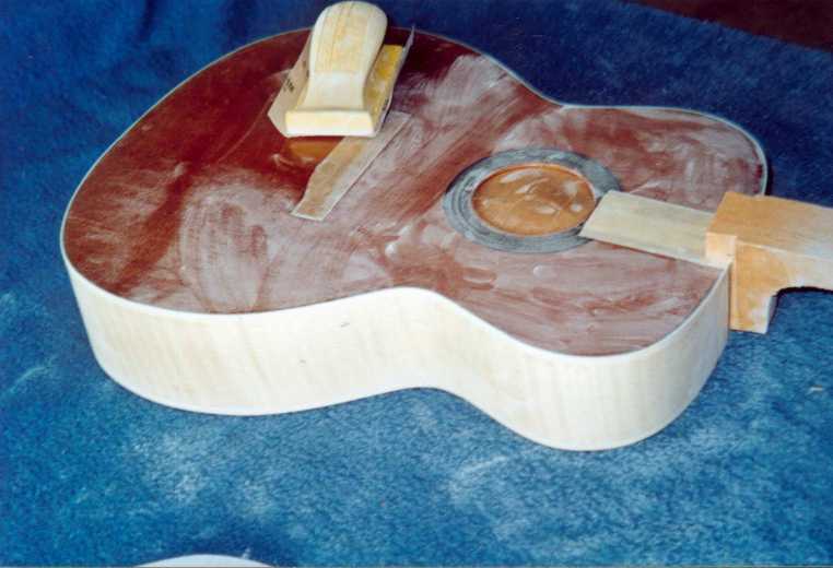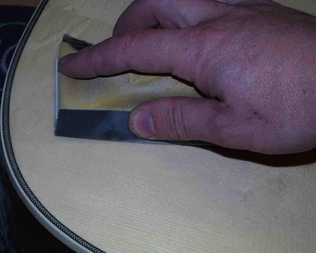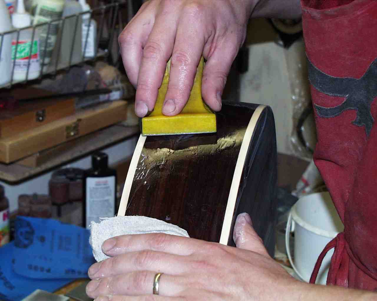 Nach der Trocknung wird die gesamte Lackfläche in mehreren Schritten naßgeschliffen. Ich fange mit 800'er Wasserschleifpapier an und arbeite mich über 1000'er, 1200'er zum 2000'er hin. Dunkles Palisander verzeiht weit weniger Kratzer als helles Ahorn. Es ist hier auf Klümpchenbildung und häufiges Wechseln des Schmirgelpapiers zu achten. Da ja Wasser der eigentliche Feind des Instruments ist, ist auch hier besondere Vorsicht geboten. Es darf kein Wasser in das Innere des Instruments gelangen, Schraubenlöcher quillen auf auch Lackrisse durch eingedrungenes Wasser sind tunlichst zu vermeiden.