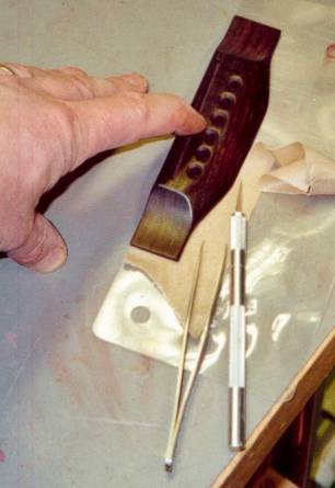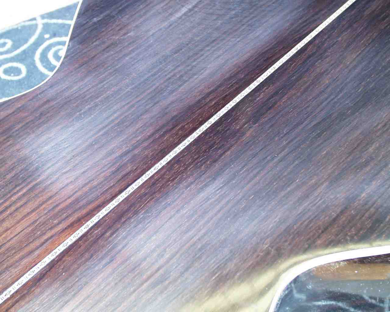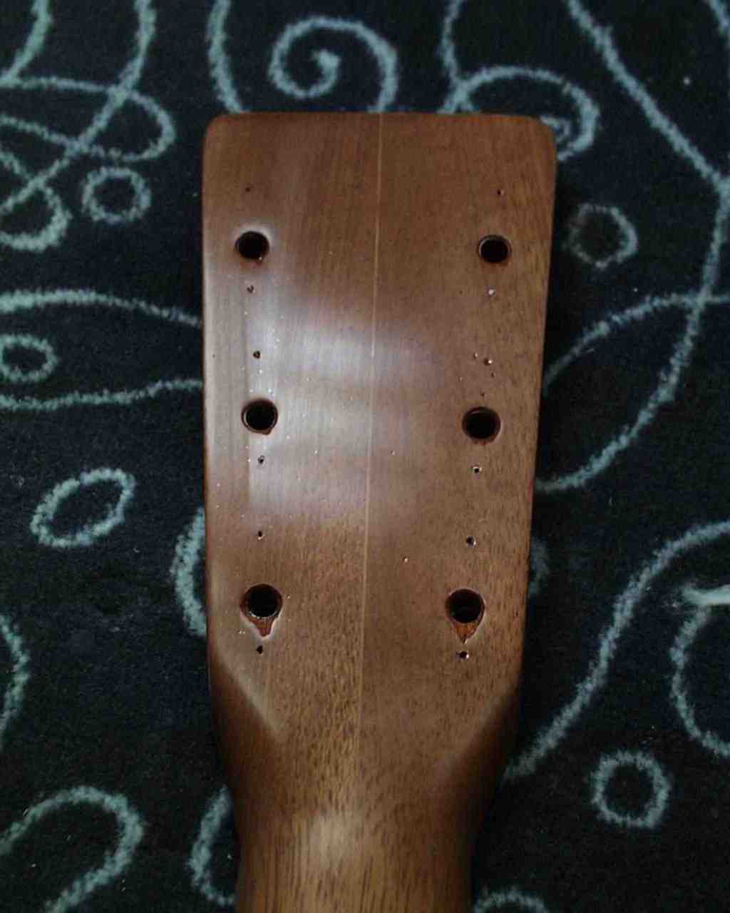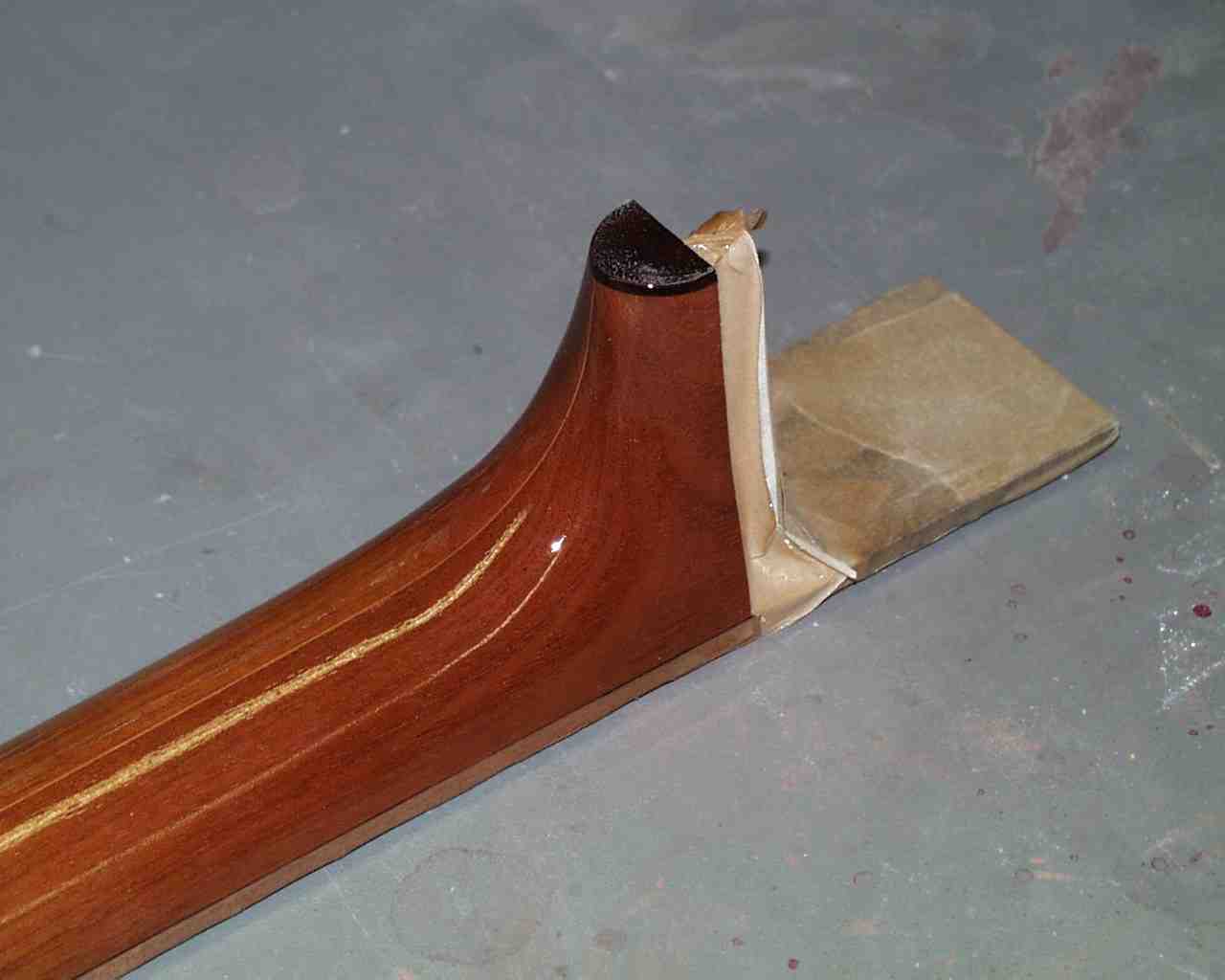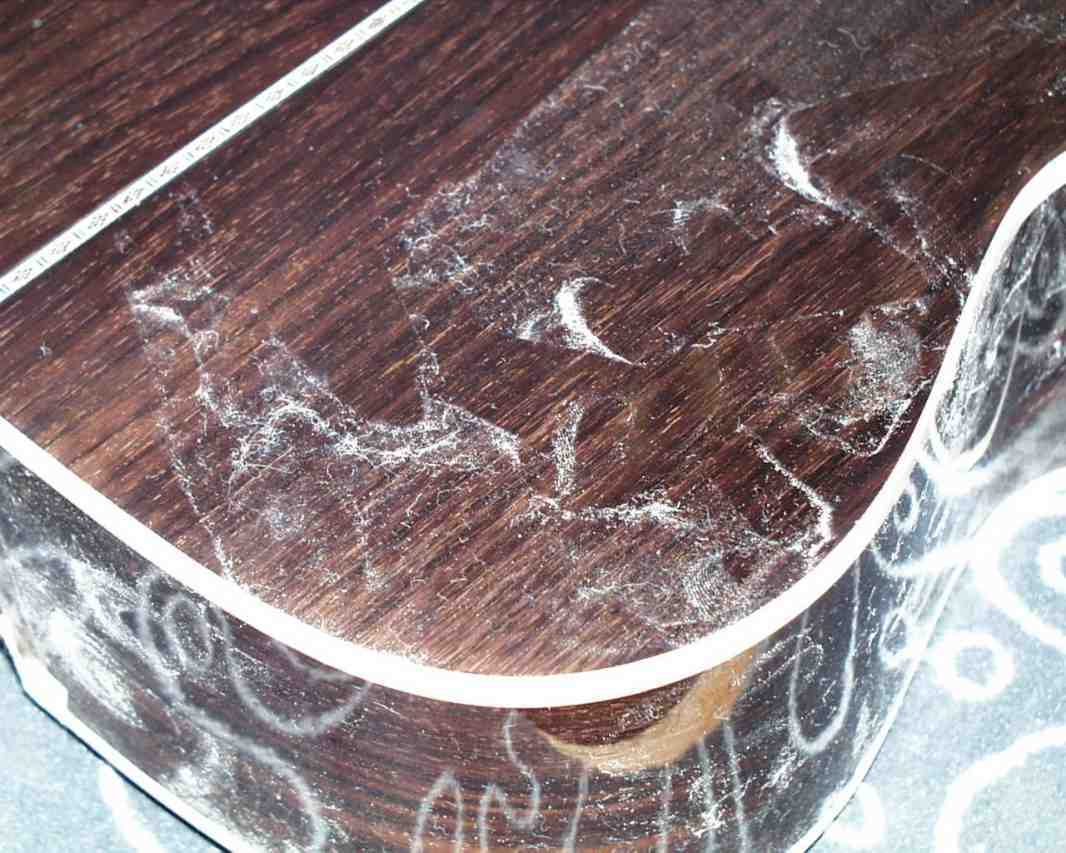 Nach der Trocknung wird die gesamte Lackfläche in mehreren Schritten naßgeschliffen. Ich fange mit 800'er Wasserschleifpapier an und arbeite mich über 1000'er, 1200'er zum 2000'er hin. Dunkles Palisander verzeiht weit weniger Kratzer als helles Ahorn. Es ist hier auf Klümpchenbildung und häufiges Wechseln des Schmirgelpapiers zu achten. Da ja Wasser der eigentliche Feind des Instruments ist, ist auch hier besondere Vorsicht geboten. Es darf kein Wasser in das Innere des Instruments gelangen, Schraubenlöcher quillen auf auch Lackrisse durch eingedrungenes Wasser sind tunlichst zu vermeiden.