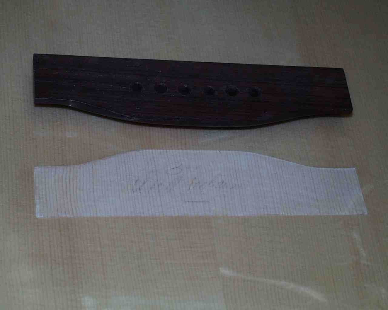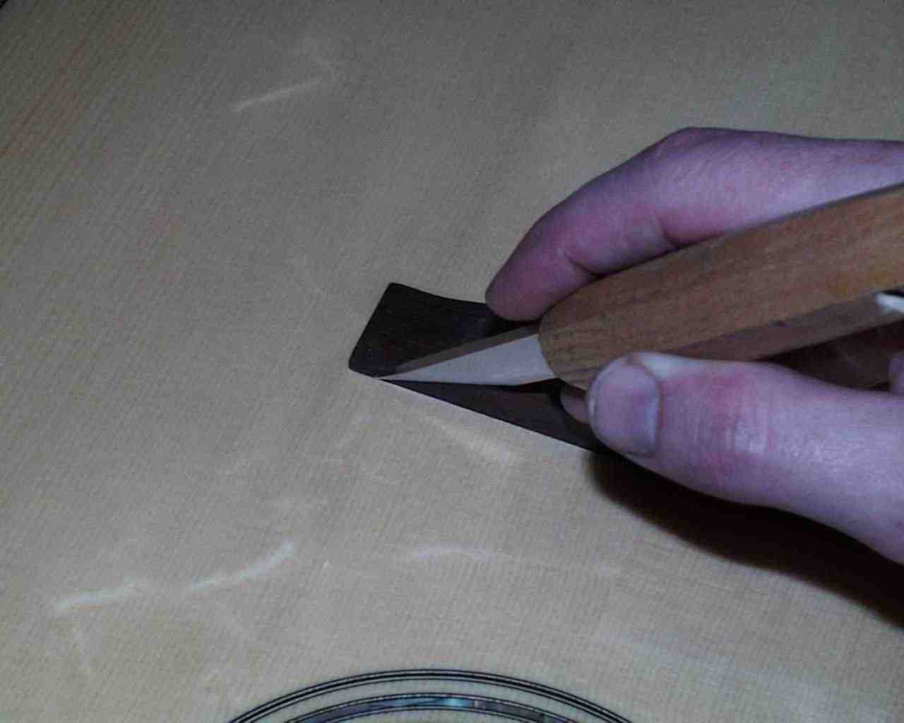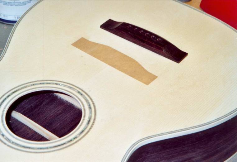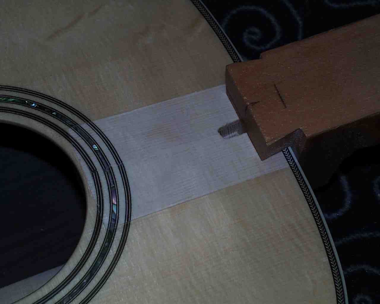 Die Leimflächen des Stegs und des Halsansatzes müssen vor der Lackierung abgeklebt werden. Gerade beim Steg muss diese Abklebung genau zugeschnitten sein. hierzu klebe ich ein Stück Klebestreifen auf einen Plexiglasträger und schneide mit einem Skalpell um den Steg herum. Nach dem Abziehen des Überstands kann die Folie direkt auf die Decke geklebt werden.