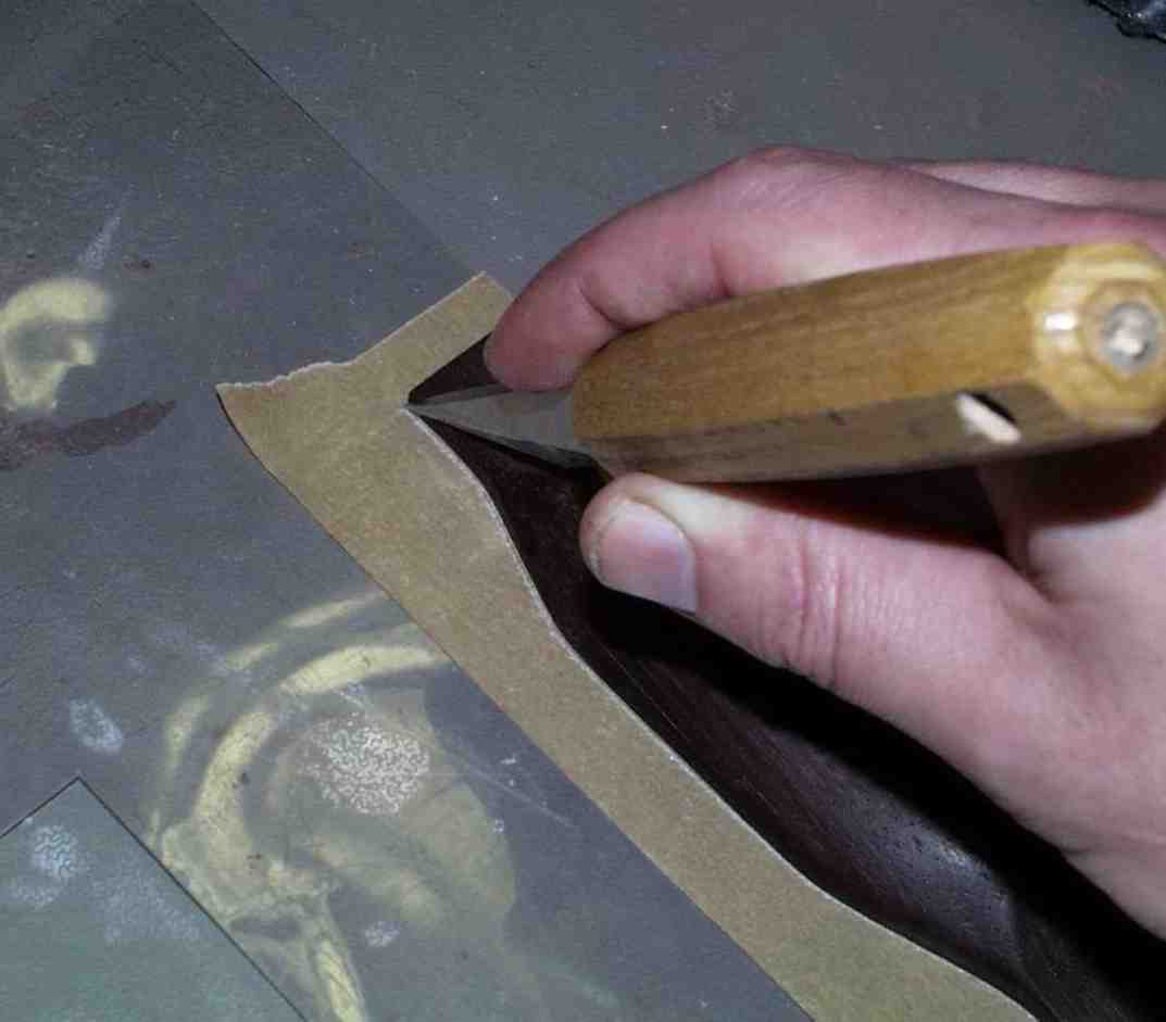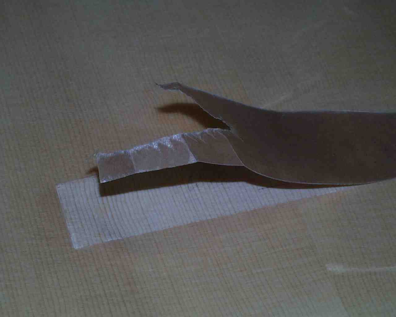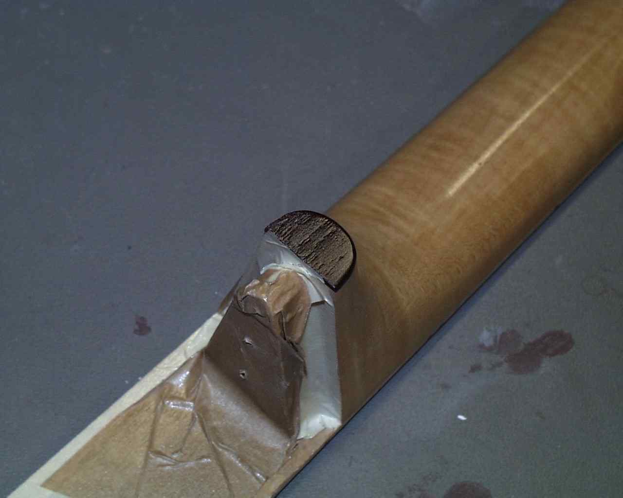 Die Leimflächen des Stegs und des Halsansatzes müssen vor der Lackierung abgeklebt werden. Gerade beim Steg muss diese Abklebung genau zugeschnitten sein. hierzu klebe ich ein Stück Klebestreifen auf einen Plexiglasträger und schneide mit einem Skalpell um den Steg herum. Nach dem Abziehen des Überstands kann die Folie direkt auf die Decke geklebt werden.