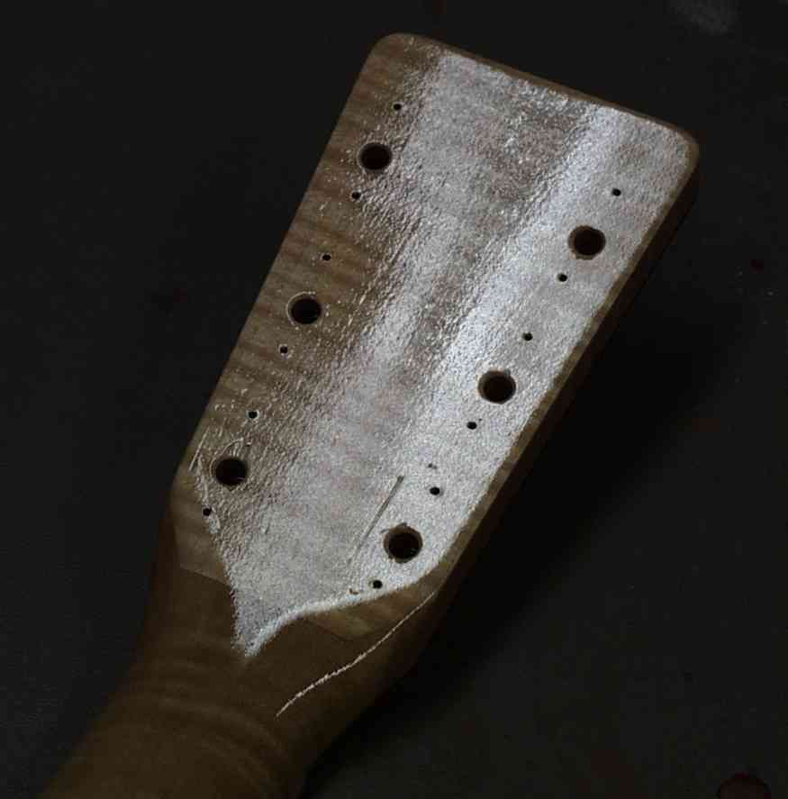 Die Poren der Korpusse und das Mahagoni des Halses müssen als Grundschicht gefüllt werden. Hierzu verwende ich einen Grain Filler der Firma Behlen. Da das farbliche abmischen nicht ganz leicht ist, können auch farblose Lackgrundierungen verwendet werden.