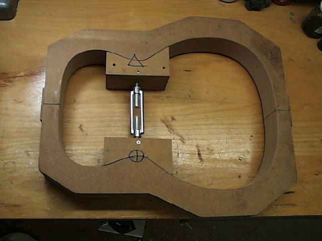 Etwas mühseliger ist das Herstellen der Zargenform. Man benötigt dazu 28mm starke MDF Platten. Auf eines dieser Platten wird die Außenkontur einer Gitarrenhälfte und zum besseren Ansetzen der Zwingen auf der Gegenseite eine Stufenform aufgezeichnet. Schneidet und bearbeitet man eine Plattenhälfte und benutzt dann diese als Anlaufsschablone mit der Oberfräse, kann man mit dieser Form der Rest der Gitarrenhälfte kopieren (6 Stück insgesamt). Damit die Anlaufform auf dem Brett positioniert wird, steckt man zwei Dübel durch Ø10mm Löcher die sich in beiden MDF Platten befinden. Anhand diesen Bohrungen können die kopierten Bretter ohne viel Nacharbeit aufeinander verleimt werden. Die Formhälften werden dann mit Hilfe kleiner Brettchen aneinander geschraubt. Um sicher zu sein, dass die Zargen an der Taillie passen, werden mit zwei Gegenformen, gehalten von einem starken Seilspanner, die Zargen eingespannt.