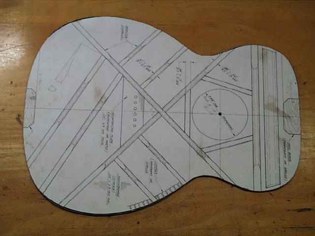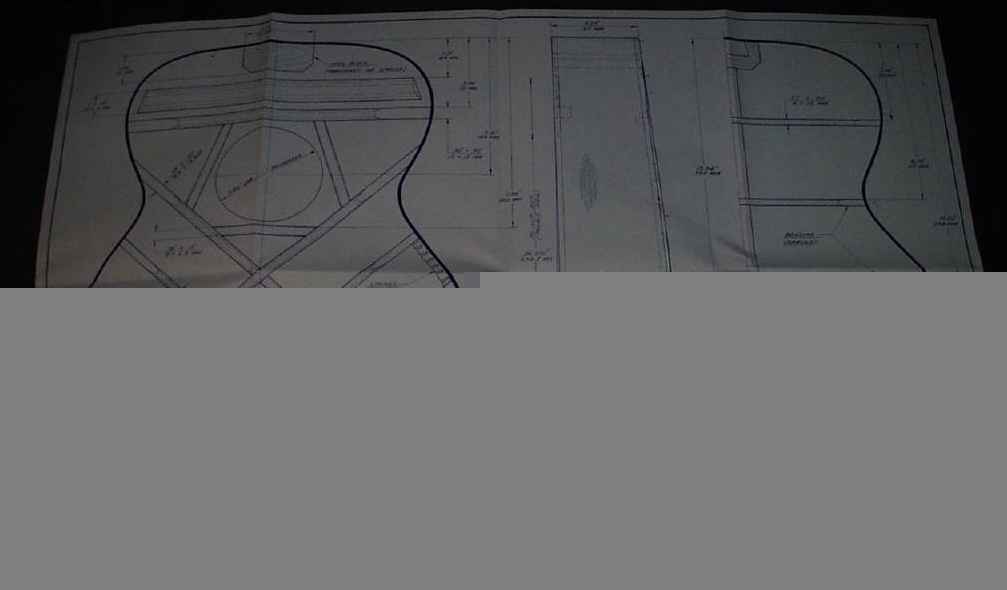 Für mich persönlich ist neben der Lackierung die Planung das wichtigste am Bau einer Gitarre. Sowohl das eine, als auch das andere kann eine ganze Arbeit komplett zerstören. Man kann natürlich nicht alles einplanen oder vorhersehen, aber die gröbsten Fehler lassen sich durch einfache Konstruktion absolut vermeiden. Beliebte Fehler sind z.B. dass der Saitenabstand auf dem Steg von der Standardbohrung zu wenig Abstand auf dem Griffbrett seitlich übriglässt oder das Griffbrett macht nach dem Korpusübergang einen ordentlichen Knick auf der Decke, da die Deckenwölbung nicht zum Halswinkel paßt. Also, am besten sowohl die Seitenansicht (das ist die Ansicht von der Seite, also nix mit Saiten!) als auch die Draufsicht im Maßstab 1:1 aufzeichnen und von diesem Plan dann die Maße entnehmen. Ich habe es mir aber viel einfacher gemacht. Da diese Gitarre schon einige hunterttausend mal kopiert wurde, gibt es natürlich irgenjemanden, der das Ding abgemessen hat und nun den Plan verkauft. Es gibt diese Pläne z.B. bei Elderly Instruments oder Luthiers Mercantile in den USA für 10US$. Man braucht zwei Pläne, einen zum nachsehen und aufhängen, den anderen zum aufziehen auf 8mm MDF Platten um daraus Schablonen herzustellen (1x kaufen, 1x kopieren?).