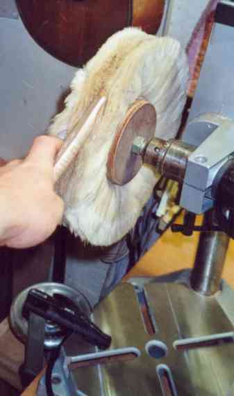Mit einer Schwabbelscheibe und etwas Hirschhorn Wachs wird der fast fertige Steg poliert.