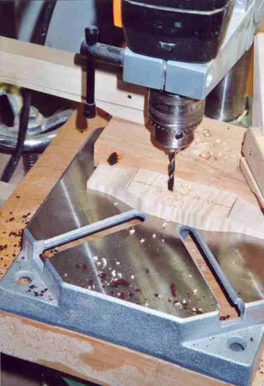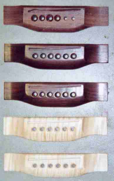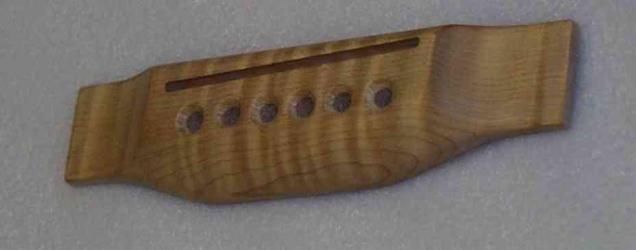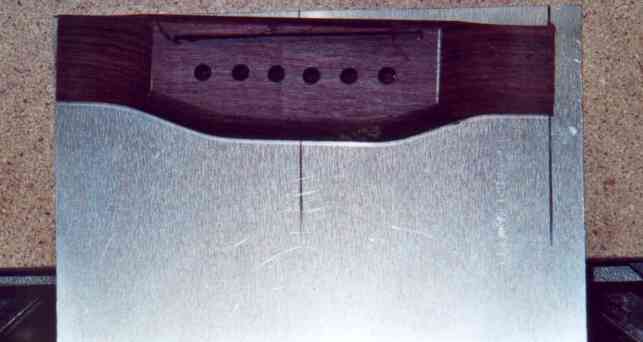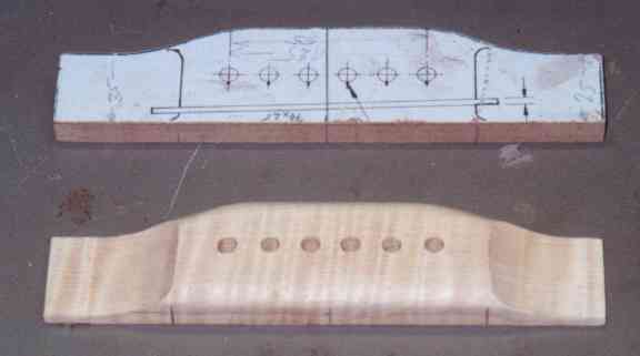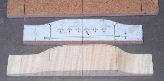 Für den Steg braucht man ein schmales Stück Hartholz mit stehenden Jahresringen. Üblicherweise wird Palisander verwendet, geriegelter Ahorn macht aber einen ebenso guten Steg. Ich machte mir zuerst eine Holzschablone, zeichnete die Umriße auf das Holzstück und sägte diese aus.
