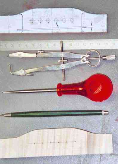 Die Position der Saitenlöcher werden angezeichnet und mit einem scharfen Bohrer angefertigt.