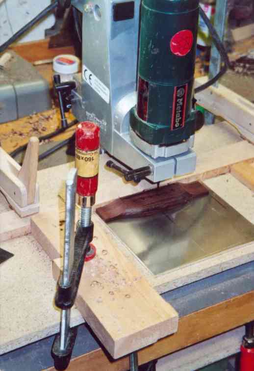 Ein Fingerfräser mit 2,5mm Durchmesser schafft den Kanal. Das Blech samt Stegrohling bewegt man an einer Leiste entlang, den Stop links und rechts habe ich mit einer Schraubzwinge befestigt.