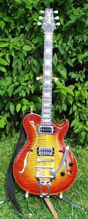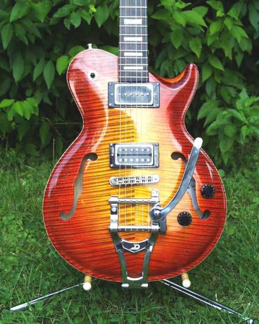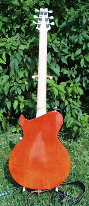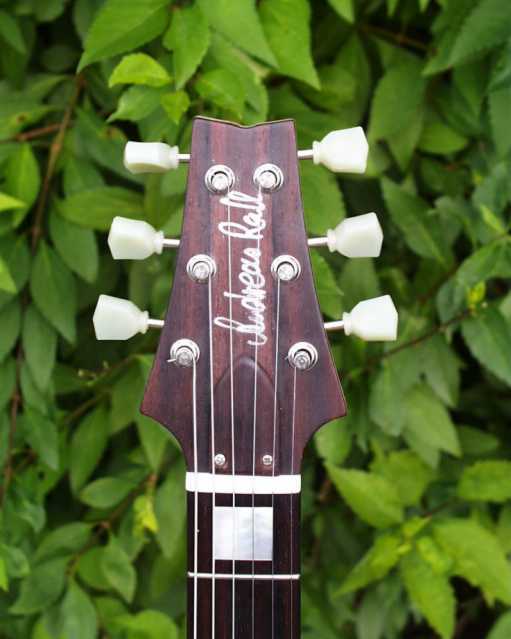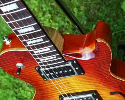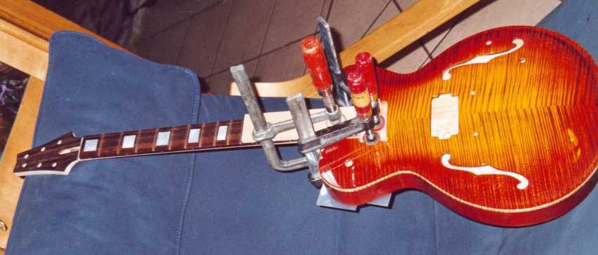 Es sei aber zur Vollständigkeit gesagt, dass der Hals aus feinem Riegelahorn hergeMaking the neckstellt wurde (Stahlstab 400mm, Knocheneinlage, Kluson-Style Mechaniken). Die Halsform hinten ein kräftiges aber angenehmes fast Halbrundprofil besitzt. Die Oberfläche wurde gewachst, das Griffbrett geölt. Afrikanischer Palisander, welcher von der Maserung stark an Rio-Palisander erinnert, wurde als Griffbrettholz verwandt, als 2,5mm starkes Furnier des gleichen Holzes ist auf die Kopfplatte geleimt. Perlmutteinlagen wurden auf einen 12 " Radius eingearbeitet. Dunlop 6105 Medium Bünde runden das Bild ab.