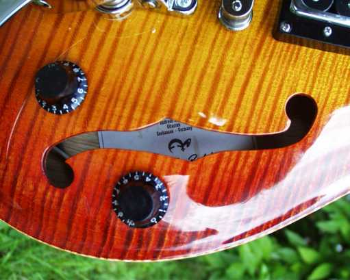 Hier noch einige Detailaufnahmen, die das F-Loch, den Headstock samt Decal und den ergonomischen Cutaway zeigen.