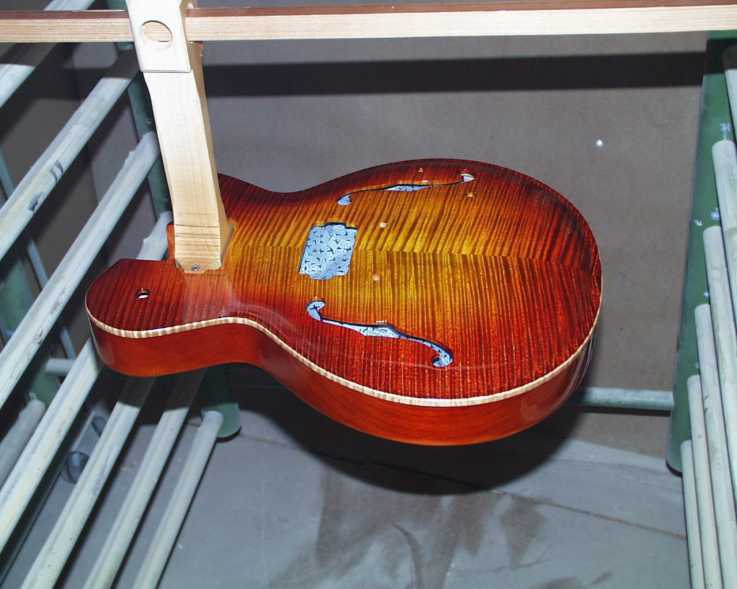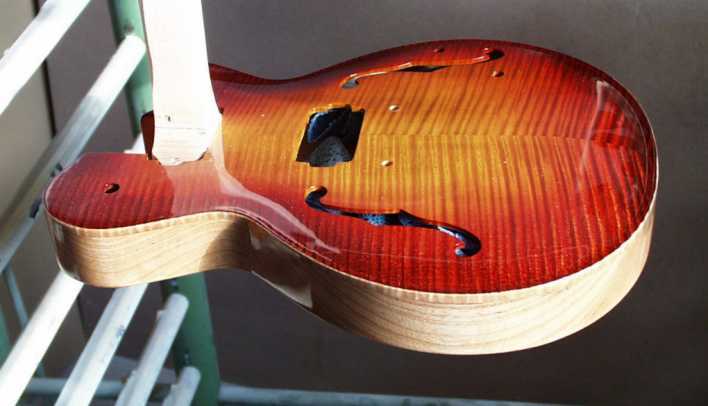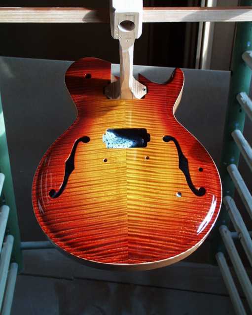 Farbauftrag kann man unterschiedlich machen. Zum einen unter den Lack, also direkt auf das Holz. Weiter kann gefärbter Lack während den ersten Lackschichten den gewünschten Effekt erzielen. Auch die Kombination beider Techniken, also z.B. Grundfärben mit einer Farbe und gefärbte Lackschichten machen dann den Sundburst. Das ist z.B. der Weg, wie Fender oder andere große Marken Ihre Bursts erstellen