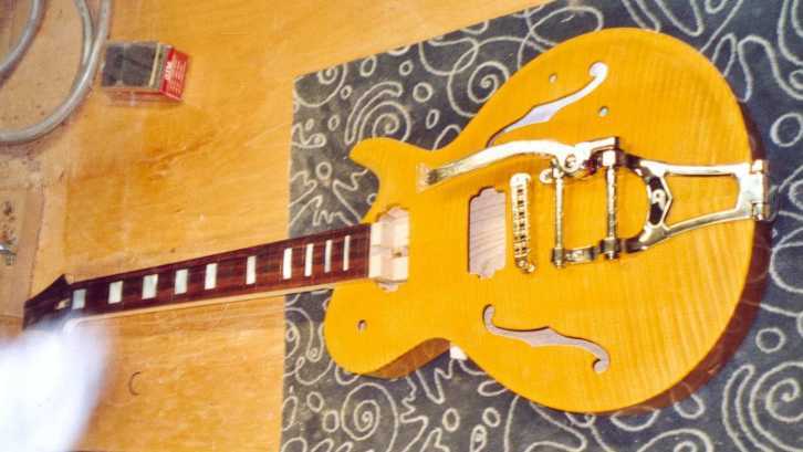 Da ich schon mehrere Beschreibungen über die Lackierung von Gitarren auf meinen Site habe, gehe ich hier nicht mehr detailliert auf die Vorbereitung und Durchführung ein. Was ich hier aber gerne vorstellen möchte, ist das im folgendem Bild ersichtliche Sunburst.