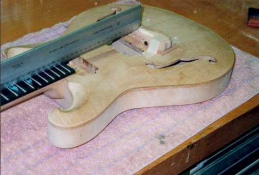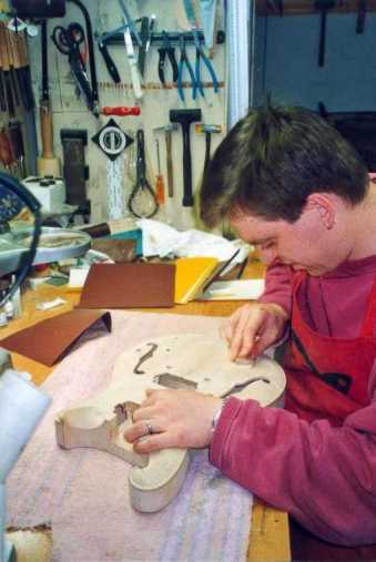 Noch einmal wird der Halswinkel kontrolliert und der gesamte Korpus mit 240'er Schmirgelpapier endgeschliffen.