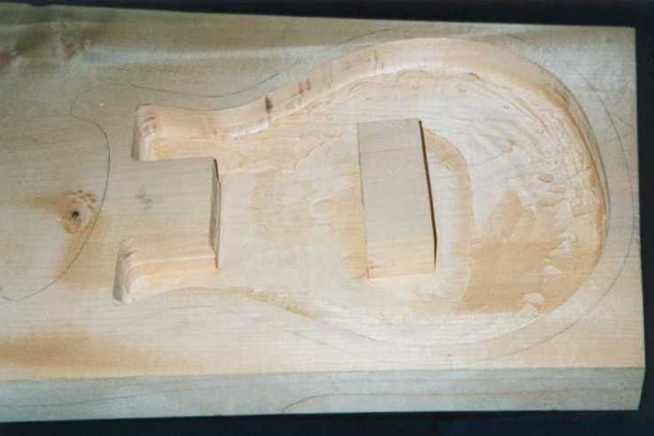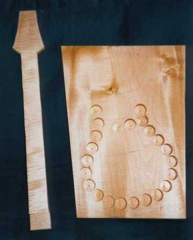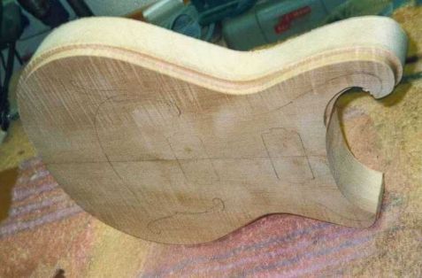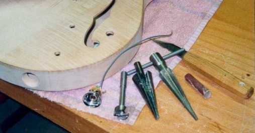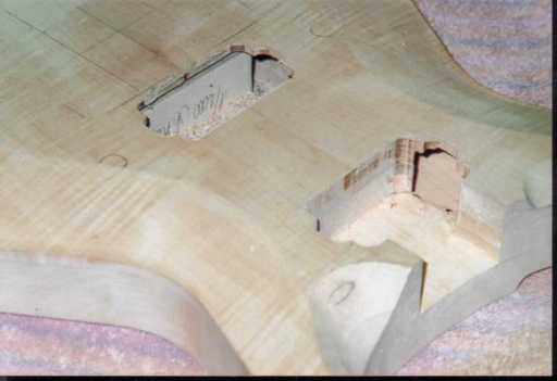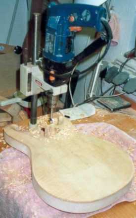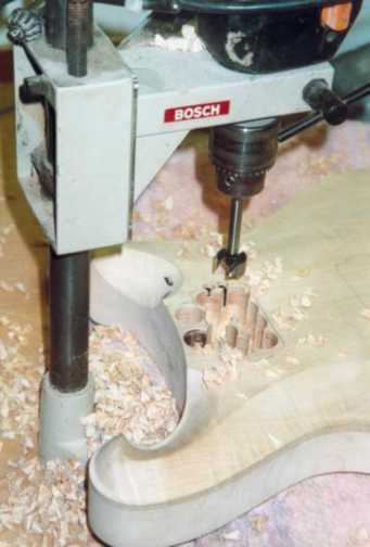 Für die Ausfräsungen der Pickups und des Halsansatzes werden diese mit einem Forstnerbohrer vorgebohrt.