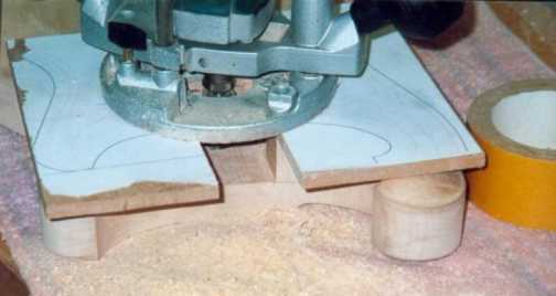 Den Lindenrohling habe ich auf 44mm Dicke gehobelt und geschliffen. Mit der Schablone habe ich die Kontur aufgezeichnet und mit einem Forstnerbohrer grob ausgebohrt. Die Innenseite der Zargen habe ich mit dem Anlaufring und der Oberfräse ebengefräst.