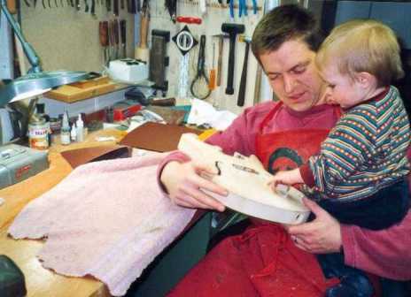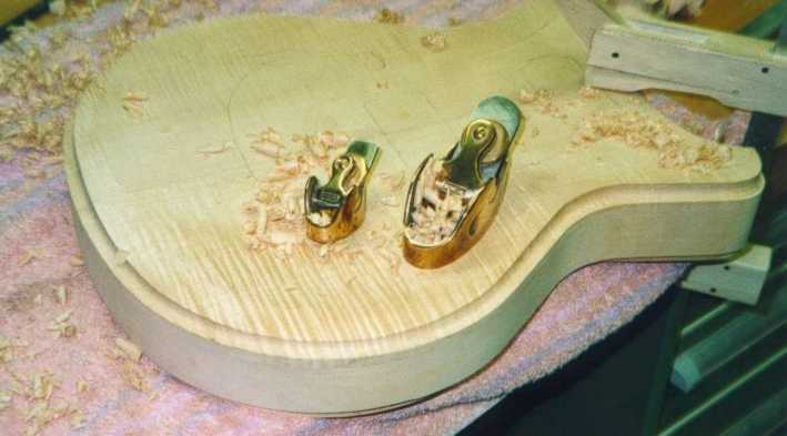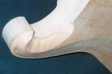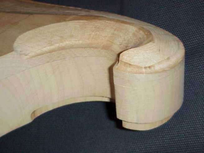 Mit weiteren Schnitzeisen, kleinen Hobeln wird der Übergang zwischen der eben Fläche und dem Absatz für das Binding weggeschnitzt.