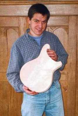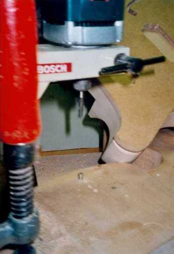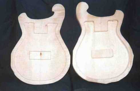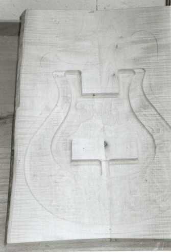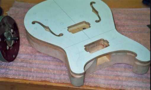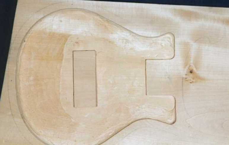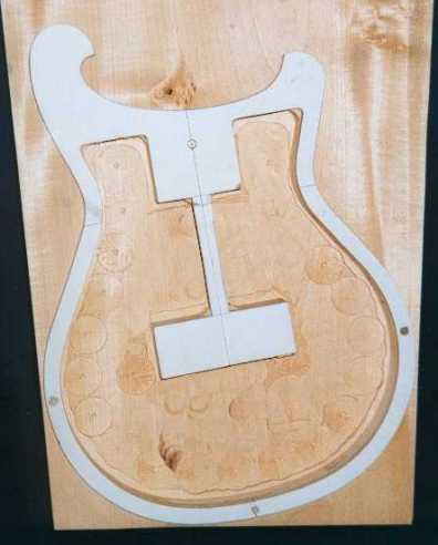 Für das Fräsen der F-Löcher verwende ich ebenfalls eine Schablone. Diese klebe ich von der Unterseite auf den Body. Ich verwende dazu einen 6mm Fräser, welcher genau gegenüber einen ebenfalls 6mm starken Pin besitzt. Dieser Pin dient als Führungsstift für die Schablone während der Fräser das Deckenholz durchfräst.