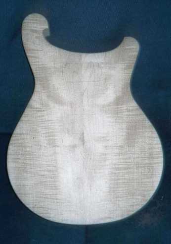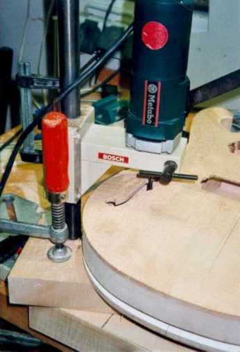 Das Binding ist nur farblich angedeutet. Den Streifen zwischen der Leimkante und 6mm des Deckenholzes wird vor Farbe geschützt. Um diesen Streifen genau zu erzielen, wird mit einem Radiusfräser oberhalb den 6mm ein Absatz gefräst.