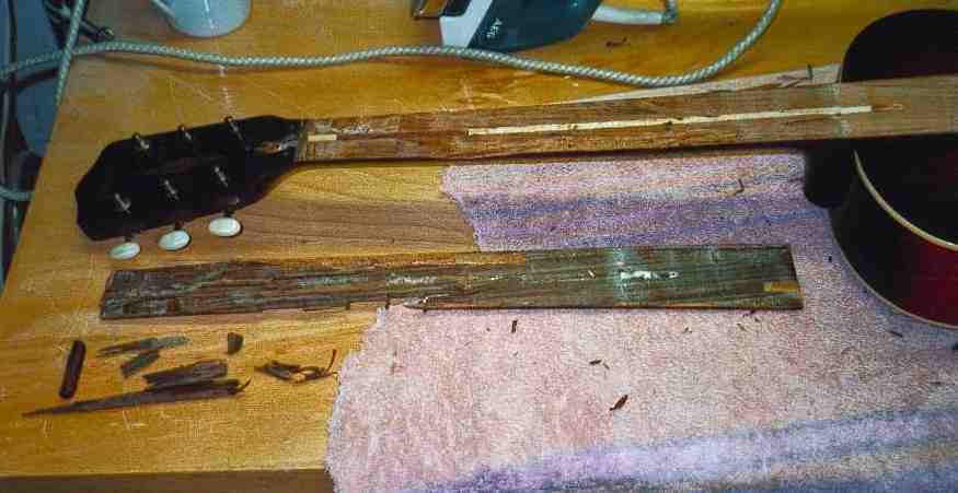 Ein Ausweg hier wäre die Reparatur durch das Abschneiden des Griffbrettes neben dem Korpusübergang (10. Bund). Man spart sich die gerade beschriebene Gefahr. Auch ich dachte wenn der Rest so gut runtergeht wie der Anfang des Griffbretts...