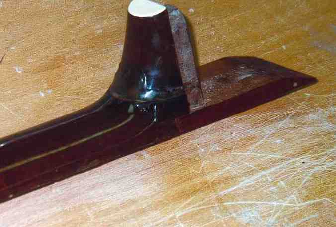 Aufgepaß werden muß bei der Kontrolle des Halswinkels, daß manche Sperrholzdecken nicht verstrebt sind und nach dem Aufziehen von Saiten leicht 3-5mm nachgeben. Durch das entfernen von Spänen und anpassen an den neuen Halswinkel sah der Übergang so aus: