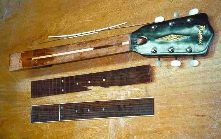 Hier im Bild sieht man neben dem neuen Griffbrett auch einen der Gründe, warum der Halsansatz brach: der Abdeckstreifen des Halsstabs war nicht da, ich habe das Loch mit Epoxi ausgefüllt. Zu erkennen sind auch die versenkten Schrauben in den Halsfuß (bitte Vorbohren!).