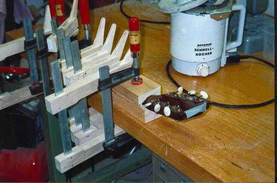 Nach 4 Wochen, öffnete sich die Fuge erneut. Diesmal habe ich gleich den ganzen Hals samt Fuß mit Dampf entfernt (Ausdrückvorrichtung a la Stewart MacDonald's). Die Sache von vorne, Leimen, Touch Up usw. Diesmal ließ ich die Gitarre aufgespannt bei mir im Wohnzimmer zur Beobachtung. Und Oh Schreck, schon wieder. Ich habe mir dann das Kräfteverhältnis angesehen und man erkennt auch aus obigem Bild, daß nur 12mm Abstand von der Leimfuge zur Decke bestehen, und der Halsfuß sehr klein ist und somit sehr wenig Klebefläche zur Verfügung steht. Der Dübel alleine hält dem Saitenzug nicht mehr Stand.