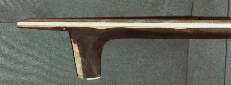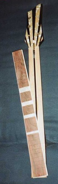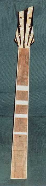 Ein wenig Material mußte noch am Halsansatz entfernt werden damit der Winkel wieder passte. Den Hals eingeleimt, neue Saiten drauf und fertig.