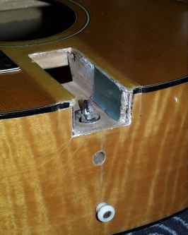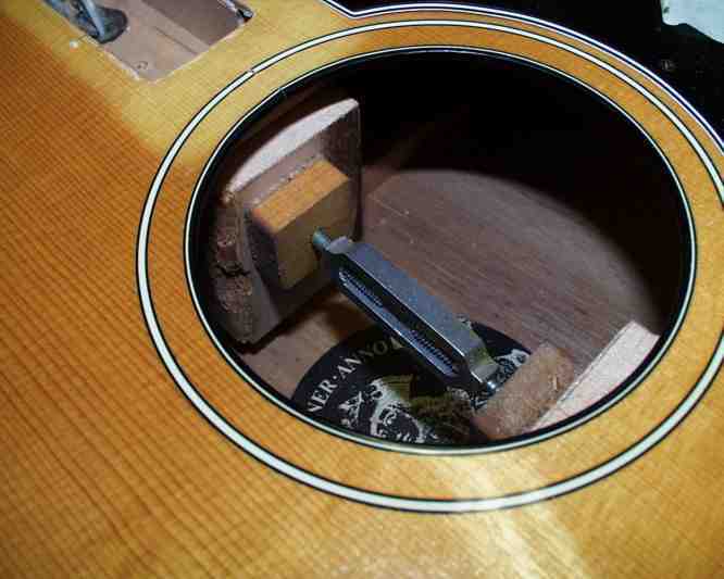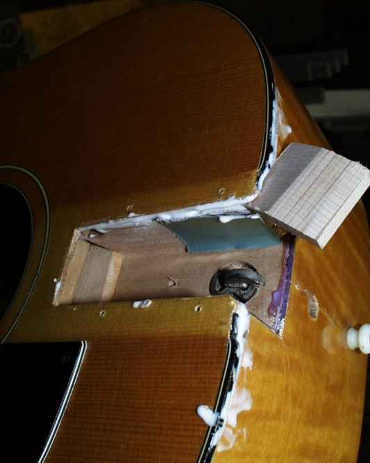 Zuerst baute ich eine Stütze in das Innere des Korpusses. Mit einem "Türken" (umgebaute Seilklemme) spreitzte ich über 2 Tage hinweg den Halsblock wieder soweit heraus, dass er mit dem Originalbinding übereinstimmte und der Halswinkel auch wieder gerichtet war.