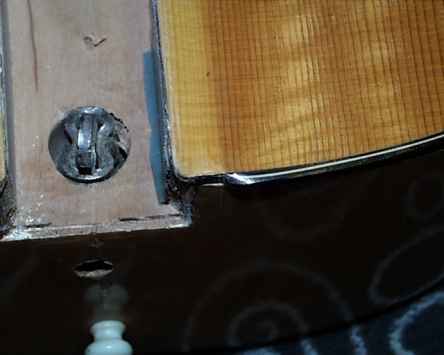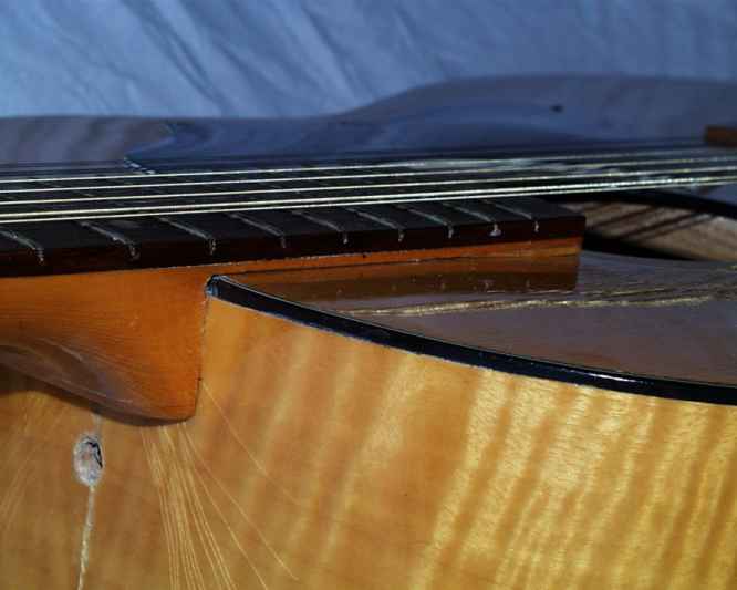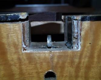 Der Saitenzug hatte das Topbinding auf 1/3 zusammengedrück und das restliche Drittel in die Decke geschoben. Beim Herausnehmen des Halses fiel ein 8mm starker Stahlstift heraus. Nach kurzem Wundern verstand ich die Konstruktion. Der besagte Haken hielt im vorderen Bereich den Hals fest, der Stahlstift saß am oberen Ende des Halsblocks und leitete das Moment und die Kraft des Saitenzugs in den Holzblock ab. Die Lage des Stahlstift-Schlitzes bestimmt somit die Saitenlage. Wohl schon sehr bald nach der Herstellung muß die Konstruktion nachgegeben haben. Es zeigte sich, dass der gesamte Halsblock an der Ober- und Frontseite von der Zarge und Decke gelöst hatte und somit verständlich wird, warum das Halsbinding so stark eingedrück war. Mit dem eingedrückten Binding hat sich auch der Halsblock selbst fast 3mm nach hinten gesenkt. Jetzt war erst einmal Tee trinken angesagt - wie gelingt die Reparatur am Besten?