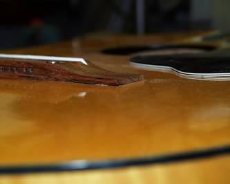 Die Decke senkte sich 3cm vor dem Schallloch etwas ab da hier ein Holzstückchen beigelegt war. Um diese Absenkung zu kaschieren, leimte ich einen dünnen Ahornkeil bei und lackierte ihn im Ton der Decke.