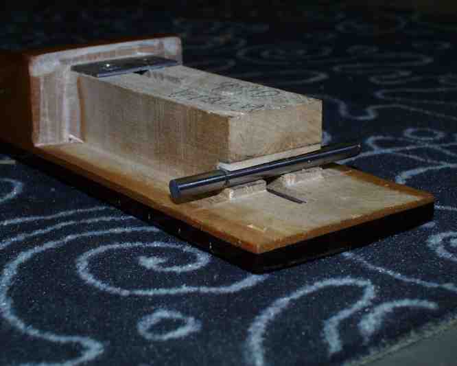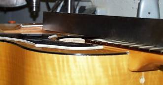 Wie oben erwähnt, bestimmt sich der Halswinkel aus der Lage des Stahlstiftes. Nach dem entfernen der Zwingen und dem Entfernen des restlichen Leims, steckt man den Hals ein überprüft mit einem Lineal die Flucht über die Bundstäbchen. Idealerweise trifft das Lineal auf die Oberseite des Stegs. Je nachdem ob der Hals steif oder weich ist, kann das um 1-1,5mm vom Ideal abweichen. Den Fehlbetrag habe ich oberhalb des Stahlstiftes weggeschnitzt und an der Unterseite mit Furniestreifen wieder angebracht.