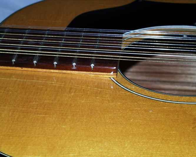 Wie bei 12-saitigen Gitarren nicht unüblich, richtete der enorme Saitenzug dem Korpus zu. Der Saitenabstand war extrem hoch, man brachte leicht den kleinen Finger darunter. Die Decke war gerade, der Steg war auch nicht locker. Komisch war aber das weiche Verhalten des Halses am Korpusübergang.
