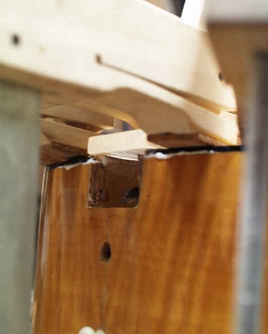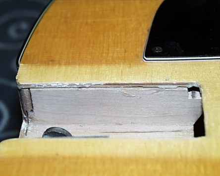 Zur damaligen Zeit waren viele Modelle mit angeschraubten Hals auf dem Markt. Dieses aber hatte keine sichtbaren Halsschrauben aber der Hals war zu weich und konnte deswegen nicht eingeleimt sein! Unterhalb des Halsfußes war ein 10mm dickes Loch mit einer M6 Madenschraube drin. Es zeigte sich, dass die Madenschraube nicht zum Verstellen des Halswinkels diente, sondern einen Haken bewegte der den Hals nach unten zog und somit befestigte. Ich dachte, dass mit einem Keil die ganze Sache erledigt sei - bis ich den Hals herausnahm und die den Schaden studierte.