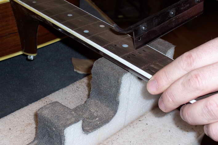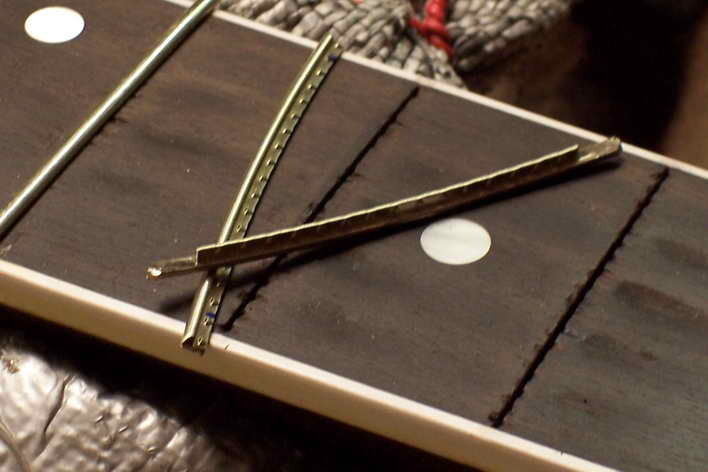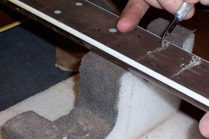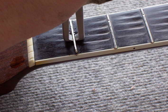 Bei Griffbrettern mit Binding ist der Bunddraht etwas nach innen ausgenommen. Hierzu verkaufe ich spezielle Zangen. Natürlich geht das auch um einiges aufwändiger mit der Feile.