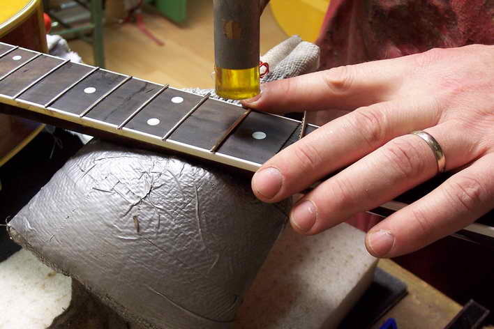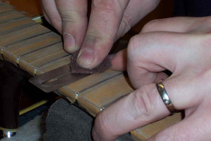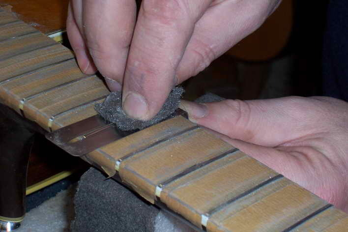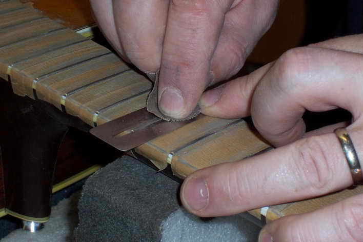In drei Stufen poliere ich die Bünde bis zum Hochglanz: zuerst Schleifleinen 320, dann Schleifflies und zu letzt 0000-Stahlwolle. Ein Griffbrettschützer verhindert das Durchschleifen.