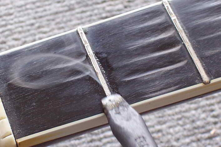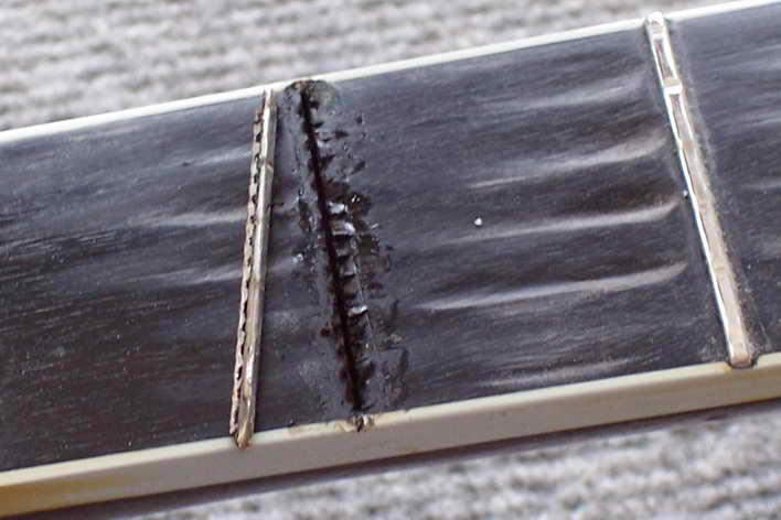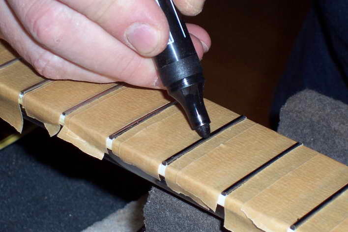 Arbeitet man mit der Bundfeile, muss man wieder die Markierung beobachten. Man hat tief genug gefeilt, wenn auf der Spitze des Kopfes ein schmaler Streifen Markierung stehen bleibt. Nun fängt das Polieren der Bünde an.