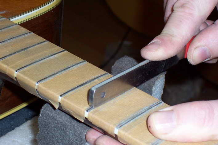 Hierzu klebt man zuerst das Griffbrett ab und markiert die Bundflächen mit dunklem, permanenten Faserstift. Auf den Schleifklotz klebt man mit doppelseitigem Klebeband Schleifleinen der Körnung 320 an. Mit leichtem Druck schleift man nun die Bundfläche ab. Die Markierung mit dem Faserstift gibt an, wann genug geschliffen ist. Man achte sehr genau auf die Markierung. Sobald sie angeschliffen ist bedeutet es, dass die Bünde in der Nachbarschaft auf selber Höhe sind und man stoppt das Abrichten.