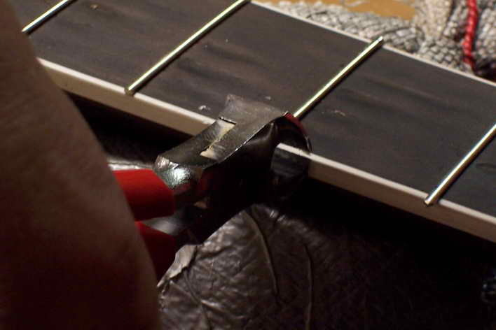 Die Bünde werden eingeklopft, seitlich abgezwickt und dann mit den Bundendenfeilen zuerst mit 90° und dann mit 35° zur Griffbrettebene abgefeilt.