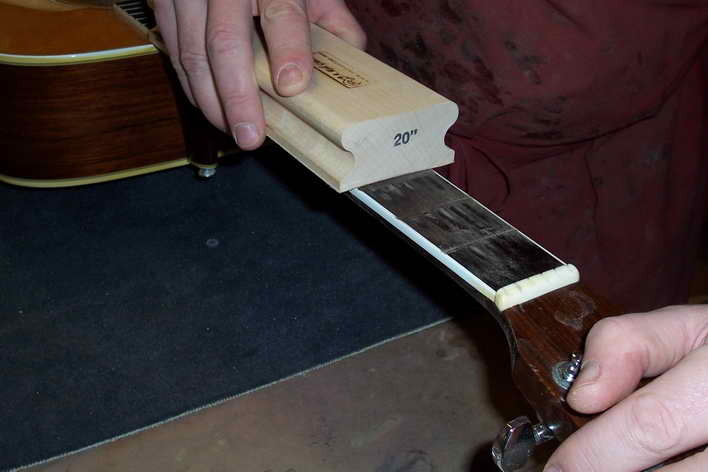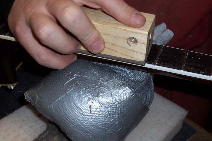 Die eingeschlagenen Bünde müssen exakt auf einer Höhe liegen. Hierzu werden sie abgerichtet. Neben den massiven Abrichtfeilen gibt es auch welche mit aufgesetztem Handstück. Hier zeige ich das Abrichten mit dem Schleifklotz.