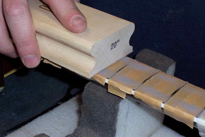 Auf einen langen Schleifklotz mit dem Radius 20" klebe ich Schleifpapier 150 und ebne es etwas ein. Nicht zu viel, weil sonst die Schlitztiefe nicht mehr aussreicht. Mit einem 220'er nachgeschliffen und die Schlitze müssen danach gereinigt werden.