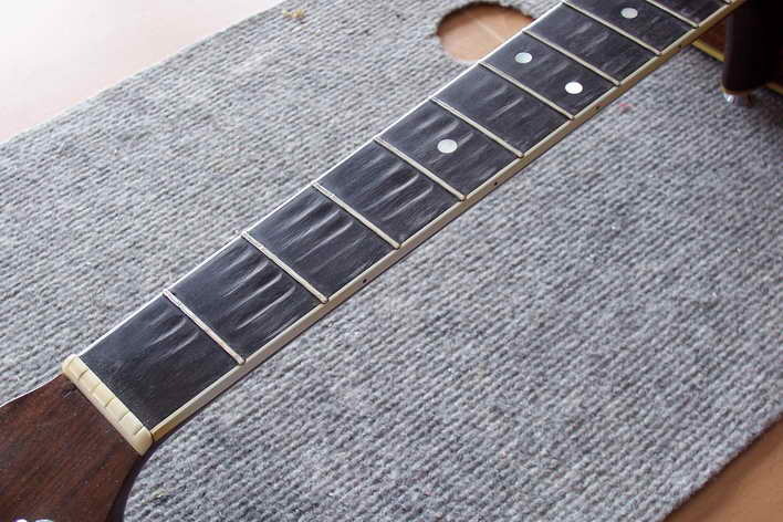 Nun kann das Klebeband entfernt werden und mit einem kleinen Lappen reibt man Griffbrettöl zur Pflege auf auf das Griffbrett.