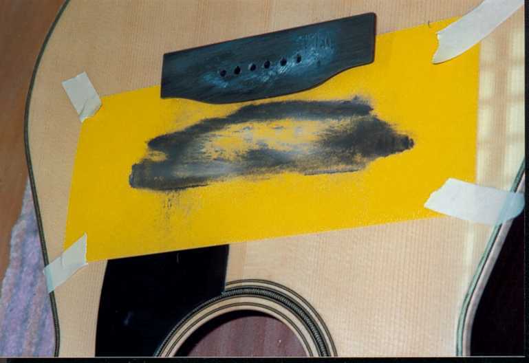 Die ersten Schritte sind das Ablösen des ganzen Stegs. Manchmal muß man die alte Position anzeichnen, um beim Wiedereinsetzen dies wieder richtig zu tun. Auch ist dies die Gelegenheit, einmal die richtige Position überhaupt zu überprüfen, manche stimmen um einige Millimeter nicht. Diese stimmt, wenn der Mittelpunkt der Stegeinlage 3,8mm hinter der Mensurlänge liegt und die Kompensation etwa 6mm/150mm beträgt (tiefe Saite weiter entfernt, gültig für 25" bis 25,75").