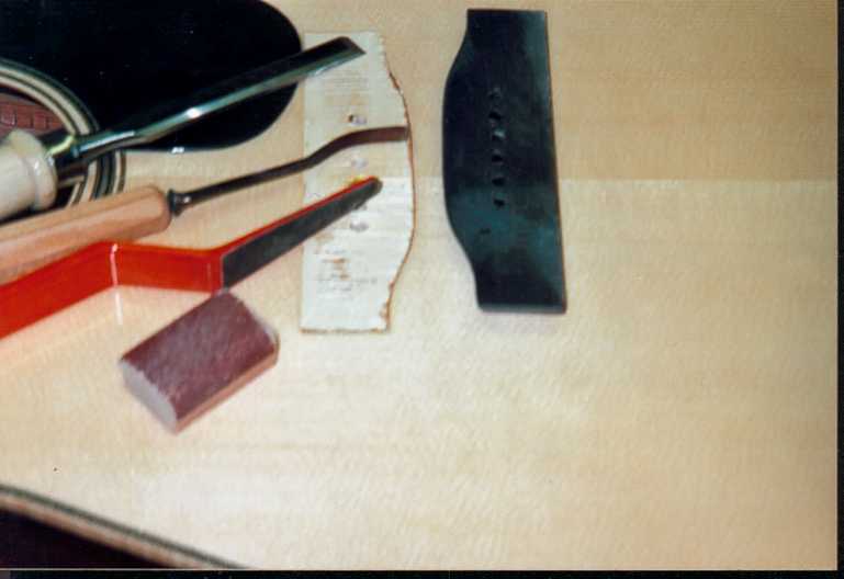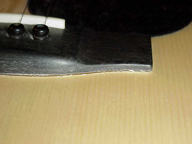Ist der Steg ab, entfernt man am besten noch im warmen Zustand die Leimreste sowohl an der Decke als auch an der Stegunterseite. Es eignen sich dazu Schmirgelpapier auf einem kleinen Holzklötzchen, Sandviks Spezialfeilen und Stemmeisen. Kann man nach dem Abheben hochstehende Holzfasern erkennen, ist es am Besten, diese mit Leim zuerst zu fixieren. Die Leimstelle muß eben und ohne Fehlstellen sein. Es ist auch durchaus erlaubt, größere Abplatzer mit Holzstücken oder Furnier zu füllen.