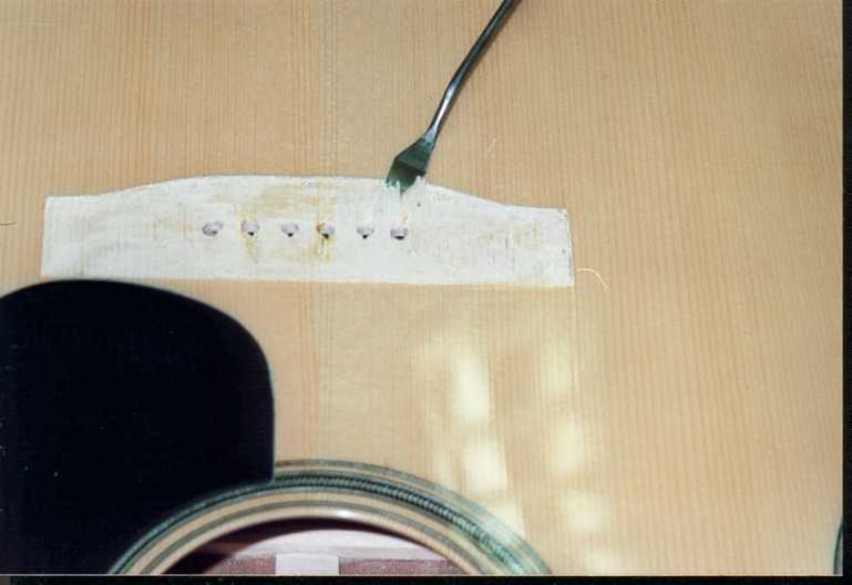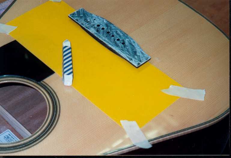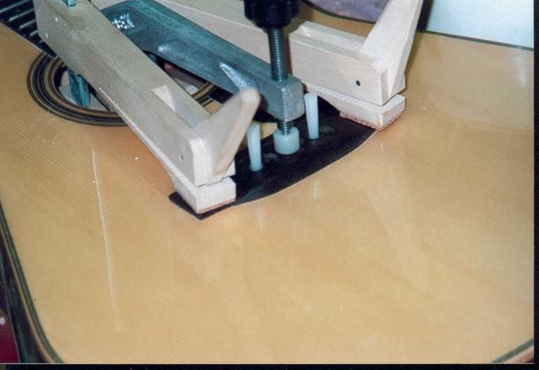 Nachdem nun die Leimflächen optimal vorbereitet sind, benötigt man drei Zwingen, die lang genug sind um durch das Schalloch den Steg zu erreichen und schmal genug sind, auf einmal im Schalloch platz zu finden. Auf der Unterseite benötigt man eine Beilage, die die X-Balken überbrückt. Man kann sich diese dadurch herstellen,dass man ein Stück Styropor and die Stelle drückt und diesen Abdruck abzeichnet auf ein Stück Holz. Da meist nur der Zwischenraum unter den X-Balken mit einem Verstärkungsbrett versehen ist, müssen die außenstehenden Ecken der Beilage mit gleichhohen (ca. 3mm) Holzstückchen aufgefüttert werden. Man kann vor dem Einsetzen der Beilage diese Ecken mit doppelseitigem Klebeband versehen und diese bereits vor dem Leimvorgang im Korpus befestigen (Trick!). Eine weitere Schwierigkeit ist das Verschieben des Stegs unter Zwingendruck auf dem glitschigen Leim. Um dies zu verhindern, gibt es kleine, kegelförmige Kunststoff Stöpsel, die, mit dem gleichen Konus der Saitenpins versehen, in zwei alte Saitenlöcher gesteckt, die Brücke während des Verleimens gegen Verschieben schützt.