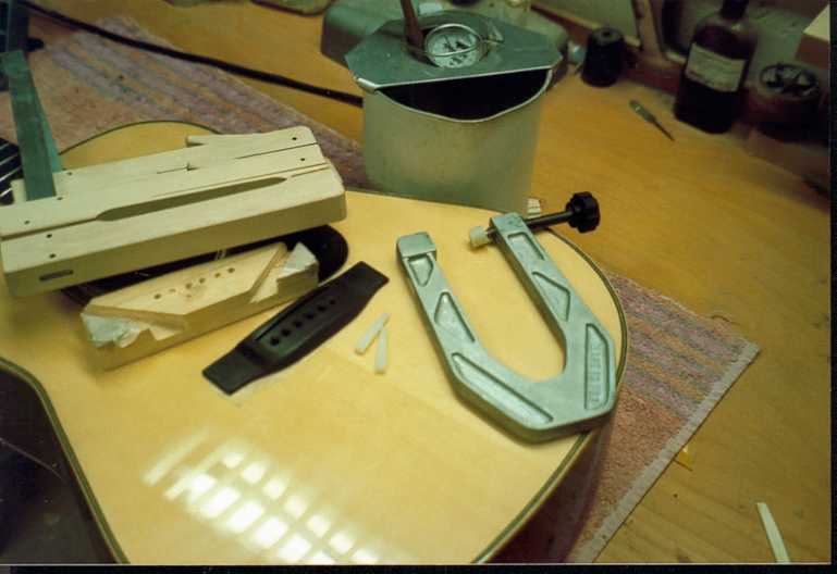Nachdem man einen Trockendurchlauf für das Klemmen gemacht hat, muß der Leim auf Temperatur gebracht werden. Leim aufbringen, Steg mit Pins fixieren, Zwingen ansetzen, Position überprüfen, überschüssigen Leim entfernen und das ganze über Nacht trocknen lassen. Vor dem Einsetzen der Knocheneinlage und Aufziehen der Saiten reinigt und poliert man noch den Gitarrenkorpus und ist dann - fertig!