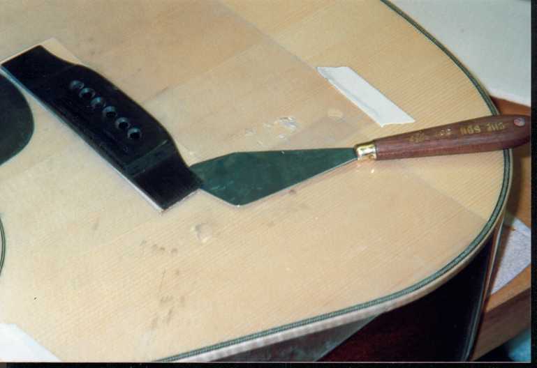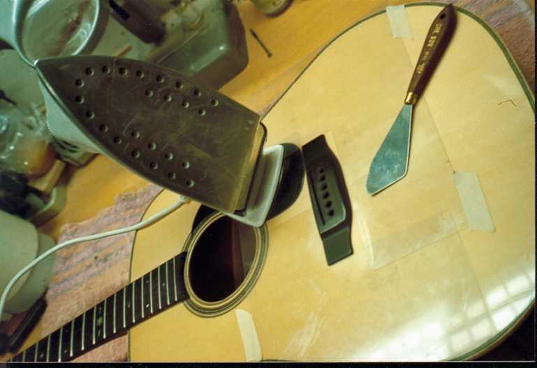 Mit einem Bügeleisen erwärmt man den Steg vorsichtig und man arbeitet sich mit einem Japan-Spachtel von den Ecken langsam voran. Den Spachtel benetzt man mit Wasser löst so den Leim an. Da die Stege gewölbt sind und man mit dem Bügeleisen hin und her fahren muß, empfiehlt es sich, die Gitarrendecke zu schützen. Das kann man mit hitzebeständigen Materialien machen aber auch mit etwas mehr Vorsicht mit einem Karton. Beim Einbringen der Wärme ist es wichtig, dass dies moderat aber bestimmt passiert. Wenn man nach 10 Minuten immer noch keine Spachtel in die Leimfuge gebracht hat, ist das Bügeleisen wohl etwas zu kalt ;-). Beim Vorarbeiten der Spachtel achtet man bitte auch darauf, ob man noch der Leimfuge folgt oder bereits in Holzfasern steckt.